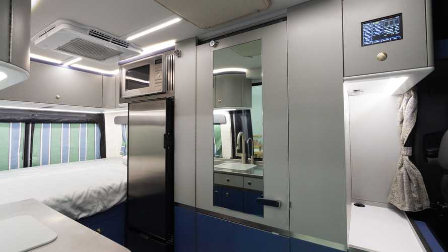 Desde el exterior, Kelvin semeja una Sprinter habitual, pero si abres la puerta de corredera puedes observar un interior bicolor azul y blanco con el equipamiento básico de una autocaravana. Incluye una cama abatible para entrar a la caja de almacenaje de abajo, un armario para almacenar elementos altos en la parte posterior, un lavatorio, una mesa, una pequeña habitación con inodoro y ducha, toma de corriente, depósito de agua y batería de litio de 11 kW por segundo. El alternador se puede cargar en el momento en que la carretilla está en marcha.