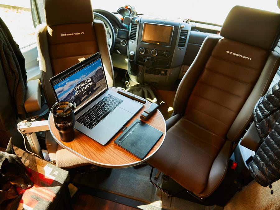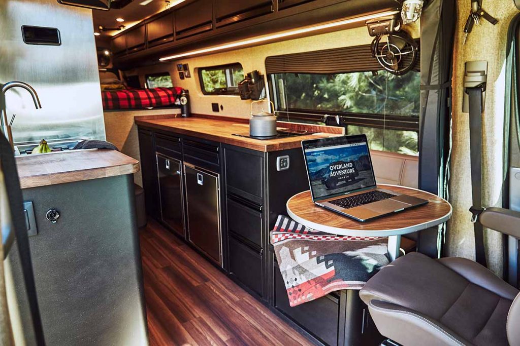 El interior de la furgoneta se ha mejorado para ordenar una cama doble y armarios de almacenaje traseros. Bajo la interfaz elevada de la cama hay un mini-estacionamiento que puede guardar las bicicletas eléctricas y las tablas de remo inflables de la pareja, junto con botiquines de primeros auxilios, cascos, tanques de comburente de repuesto de 28 galones y otros equipos para exteriores.